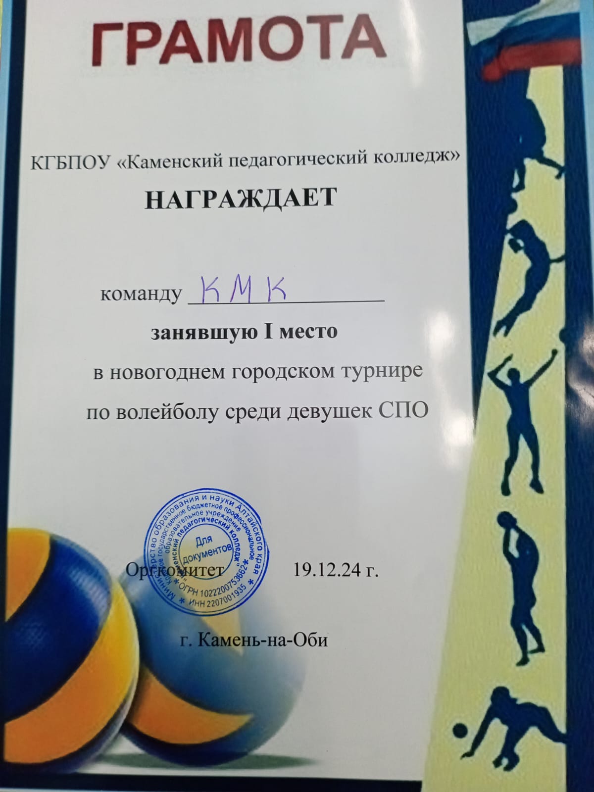 В преддверии Нового года на базе Каменского педагогического колледжа состоялись спортивные соревнования по стритболу от Движения Первых и волейболу. В стритболе приняли участие две команды: "КМК-1" - заняла второе место, "КМК-2" - стала участником соревнований.